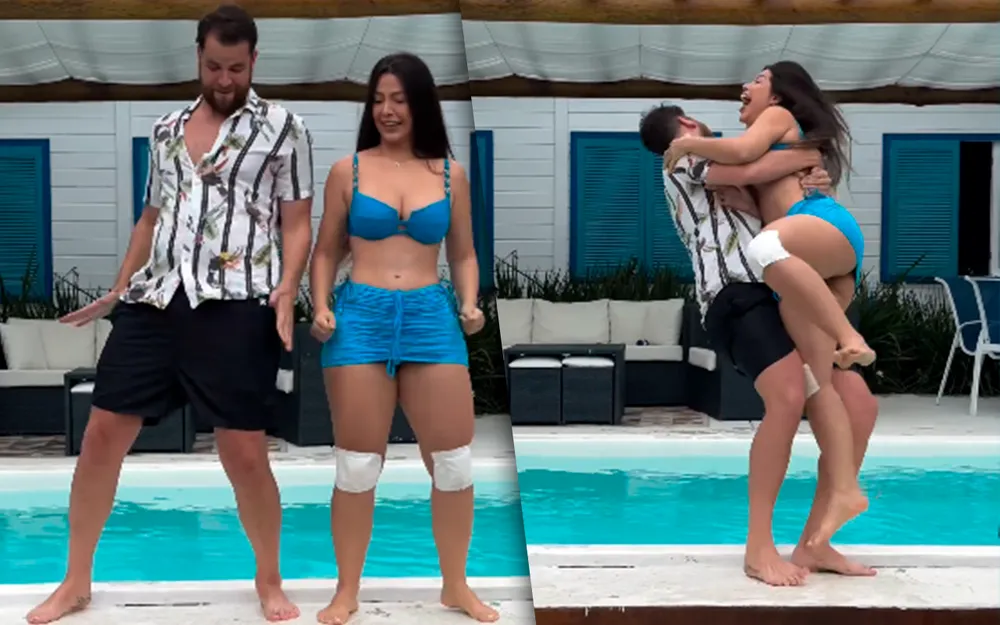 Mas um detalhe chamou a atenção: Laís apareceu com os joelhos cobertos por uma espécie de atadura. No fim do vídeo, Gustavo a puxa para a piscina e eles caem na água. Na legenda, ela escreveu, brincando: